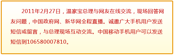 [中國(guó)移動(dòng)手機(jī)報(bào)讀者手機(jī)尾號(hào)7917]:總理好,我是一個(gè)即將畢業(yè)的大學(xué)生,我的愿望是找到一份工作。 |
