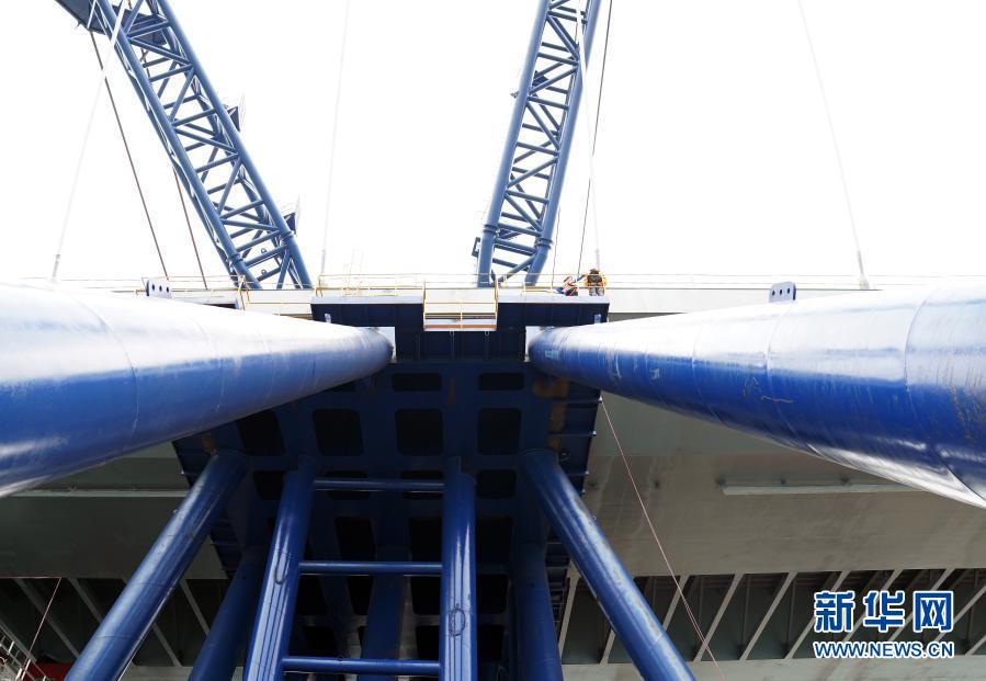 “冒出來”的并不是一座完整的大橋,而是一段跨徑長達(dá)200米的雙拱鋼橋,在海面中央兀然矗立?!斑@是我們大橋工程最核心的主橋部分,技術(shù)難度最大,對(duì)整個(gè)項(xiàng)目有里程碑的意義?!背薪▎挝恢袊窐蚬こ逃邢薰径隆㈨?xiàng)目總指揮闞軍說。