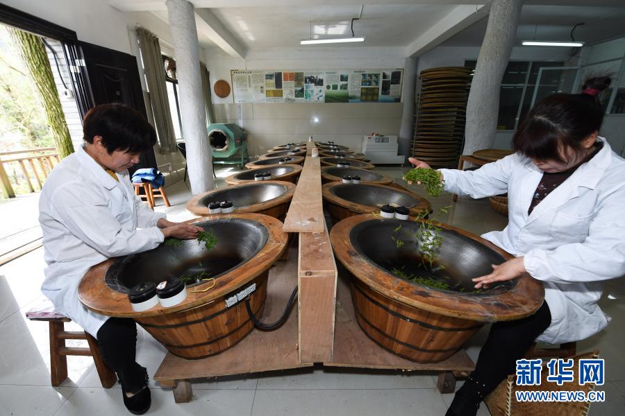 3月12日,在杭州市西湖風(fēng)景名勝區(qū)滿覺隴村的中國(guó)茶葉博物館滿覺隴炒茶中心內(nèi),茶農(nóng)在手工炒制西湖龍井茶。