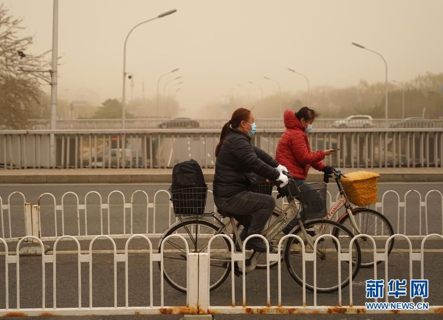 3月15日,市民騎車(chē)行駛在北京德勝門(mén)附近的道路上。當(dāng)日,我國(guó)北方多地出現(xiàn)沙塵天氣。新華社記者 賈浩成 攝