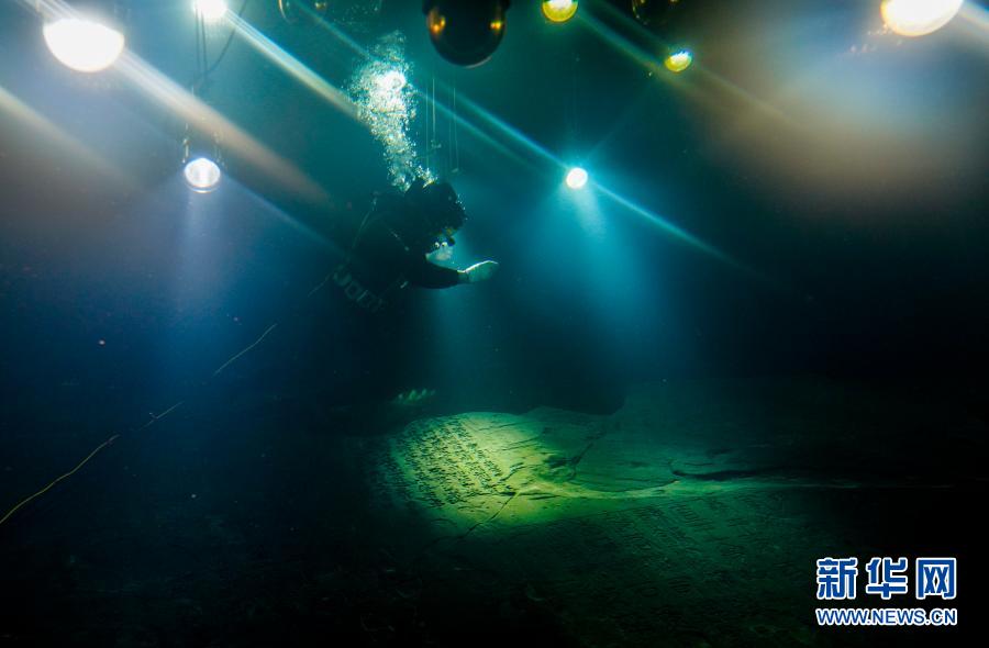 3月15日,在長江水下40多米的白鶴梁題刻無壓容器罩內(nèi),潛水員在進(jìn)行清理作業(yè)。新華社記者 劉潺 攝