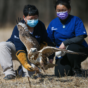 當(dāng)日,北京猛禽救助中心在北京市延慶區(qū)野鴨湖濕地公園附近空地放飛了兩只康復(fù)治療后的大鵟。此次放飛的兩只大鵟在去年12月分別被市民發(fā)現(xiàn),其中一只因饑餓、虛弱原因被救治,另一只因闖入市民鴿舍覓食被發(fā)現(xiàn)且身體有創(chuàng)傷被救治。經(jīng)過三個月的治療,兩只大鵟均已康復(fù)并達到了放歸野外標準。北京猛禽救助中心的猛禽康復(fù)師為兩只大鵟佩戴了GPS追蹤器,以監(jiān)測它們被放歸大自然后的情況。