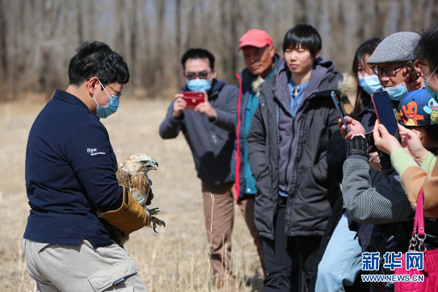 3月20日,北京猛禽救助中心猛禽康復(fù)師周蕾在放飛大鵟前向參加放飛活動(dòng)的人員進(jìn)行講解、展示。新華社記者 李京 攝