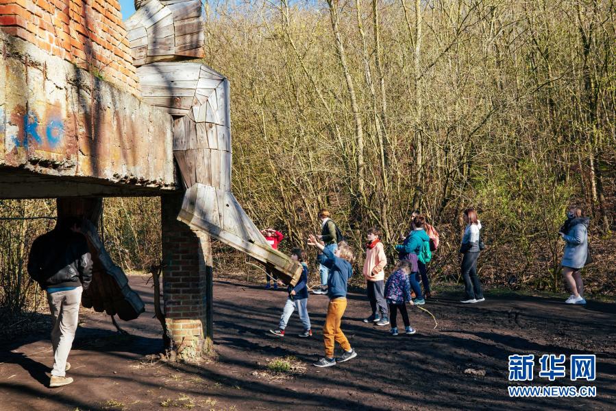 3月20日,人們?cè)诒壤麜r(shí)博姆市的德舒爾森林公園和一座“巨人”雕塑“玩?!薄P氯A社記者 張鋮 攝