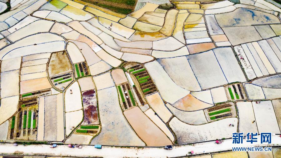 3月24日,廣西河池市東蘭縣武篆鎮(zhèn)色故村農(nóng)民在田間勞作(無(wú)人機(jī)照片)。