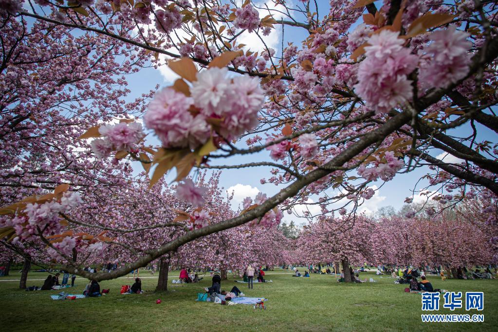4月20日,人們在法國巴黎近郊的國璽公園欣賞櫻花。