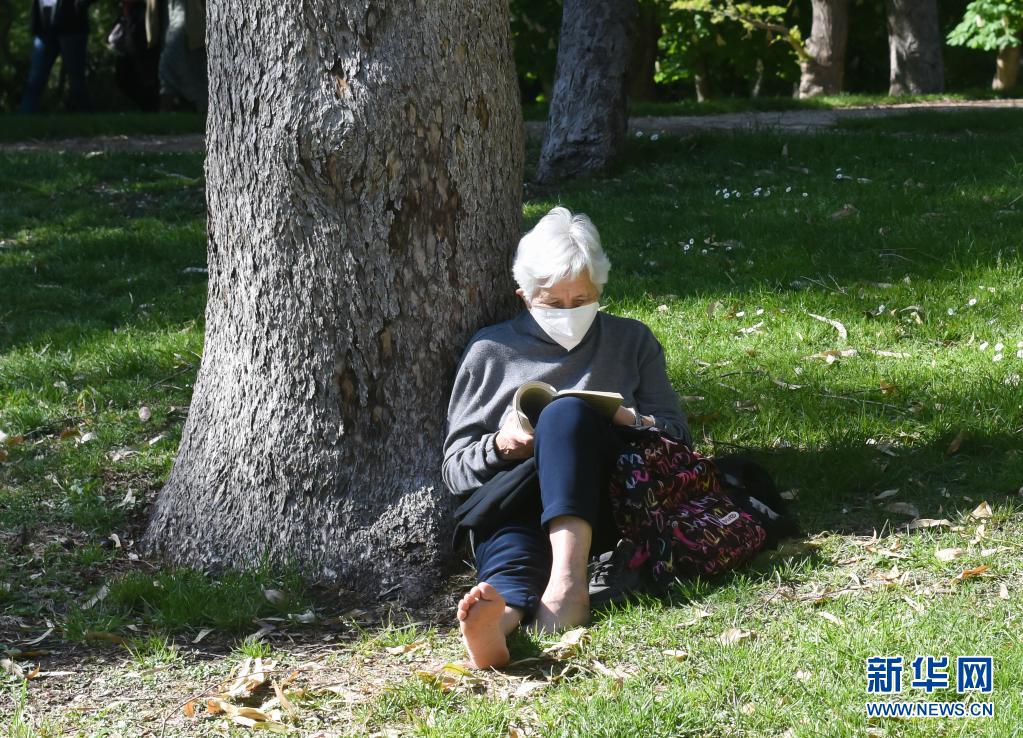 4月17日,一位老人在西班牙馬德里一個公園內(nèi)讀書。