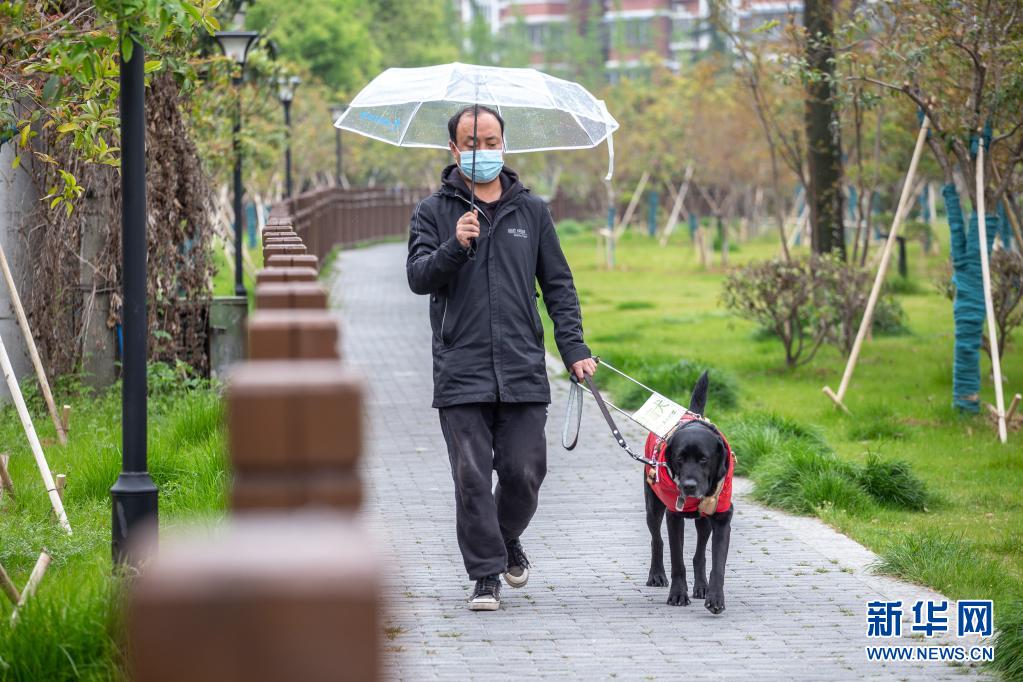 吳虎剛今年45歲,和同是盲人的妻子經(jīng)營(yíng)著一家盲人推拿診所。每天上班,導(dǎo)盲犬“C羅”都會(huì)陪伴吳虎剛從家走到診所(4月11日攝)。 新華社發(fā) (張夢(mèng) 攝)