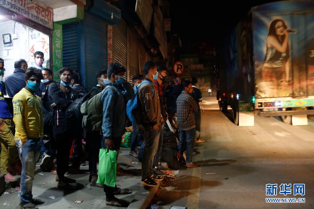 4月28日晚,人們?cè)谀岵礌柺锥技拥聺M都的路邊等車,準(zhǔn)備在封禁措施實(shí)施前離開加德滿都返回家鄉(xiāng)。