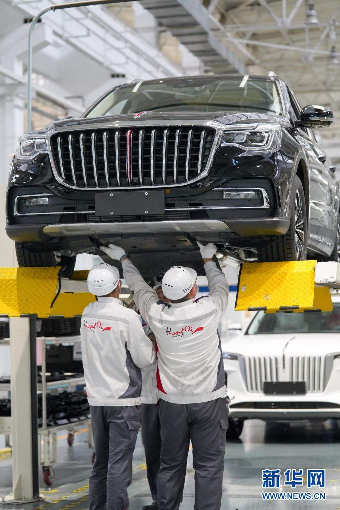 在位于吉林長(zhǎng)春的一汽紅旗工廠總裝車間,工人在裝配車輛(4月28日攝)。