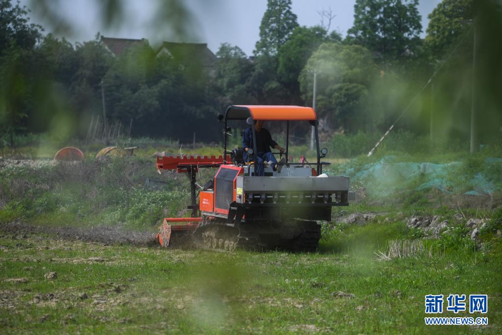 在東林鎮(zhèn)保永村,種植戶操作旋耕機耕地,準備播種水稻(5月7日攝)。