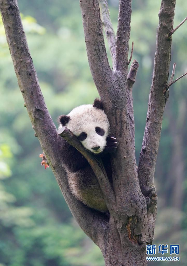 這是5月15日在中國(guó)大熊貓保護(hù)研究中心雅安碧峰峽基地拍攝的大熊貓。