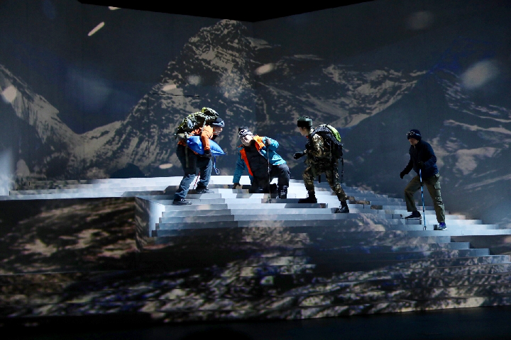 舞臺上,話劇《種子天堂》劇情進入最高潮——在缺氧、強風(fēng)惡劣環(huán)境下,鐘揚拼盡氣力來到海拔6000米的高度。當他終于在一堆雜草和冰雪中發(fā)現(xiàn)那株頑強的雪蓮時,就像父親看到自己剛出生的嬰兒,臉上掛著深深的喜悅,凝望良久……