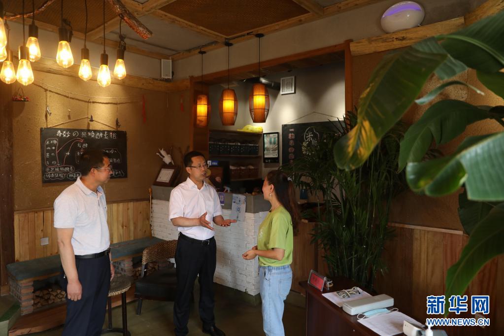7月2日,在沈陽市沈北新區(qū)興隆臺(tái)街道單家村,聞然(中)在調(diào)研民宿發(fā)展情況。新華社記者 楊青 攝