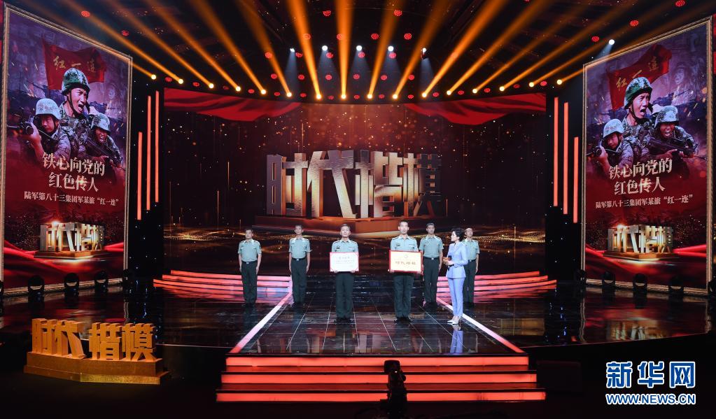 在“時代楷模”發(fā)布儀式上,陸軍第八十三集團(tuán)軍某旅“紅一連”官兵代表領(lǐng)取“時代楷模”獎牌和證書(7月23日攝)。新華社記者 張永進(jìn) 攝