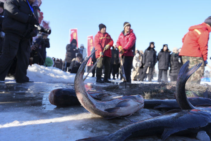 2025年12月27日拍摄的冬捕出鱼现场。当日,黑龙江大庆市杜尔伯特蒙古族自治县第九届冰雪渔猎那达慕启幕。新华社记者 王松 摄