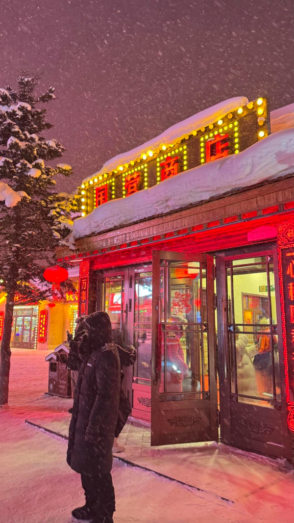 这里山高林密,雪期长达7个月,积雪随风雕琢,尽显天地造化之功。白,是大自然赋予冬季的底色,但雪乡人显然有自己的生存美学。他们将木屋刷得鹅黄,点起大红灯笼,把鲜亮的玉米棒子、辣椒挂到墙上,像是在继续把玩秋日丰收的调色盘。暮色四合,檐下的灯光次第亮起,光晕裹着暖意漫过街巷,雪乡的夜生活开始了。