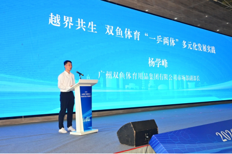 广州双鱼体育用品集团有限公司杨学峰作了题为《跃界·共生——双鱼体育“一乒两体”多元化发展实践》的主旨报告。重点介绍了双鱼体育从垂直深耕到综合布局的跨越之路,通过“乒乓+”战略重新定义体育服务新生态,展现了品牌从传统器材制造商向“产品+服务+场景”综合体系转型的创新实践。