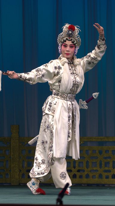 刀馬旦擅長(zhǎng)武藝,多是扮演穿蟒扎靠,戴翎子的女將,兼重唱、念和做工。其所塑造的角色既要能唱又要善打,不僅要有文戲的功底,還要有武戲的基礎(chǔ)。刀馬旦經(jīng)常在精彩的武打表演同時(shí)穿插大段唱詞,在劇烈的形體運(yùn)動(dòng)后保持昆曲特有的柔美唱腔,難度可想而知。