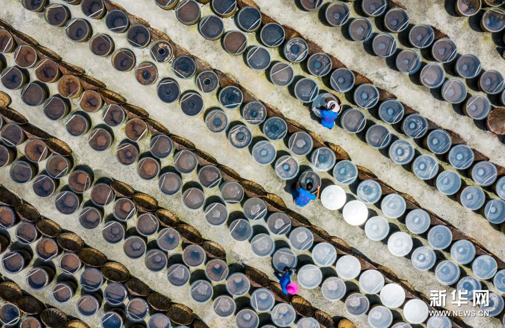 7月10日,工人在畢節(jié)市金沙縣禹謨鎮(zhèn)泡木灣醬醋基地查看醬醋晾曬情況(無人機照片)。新華社發(fā)(范暉攝)