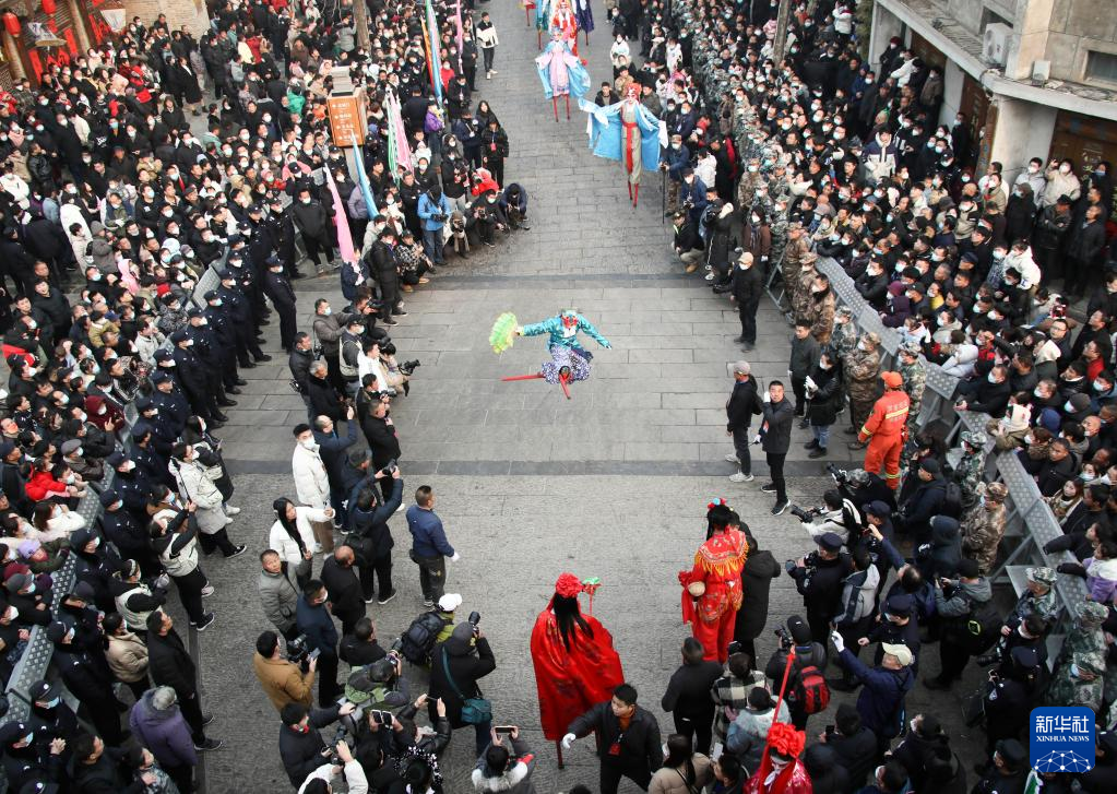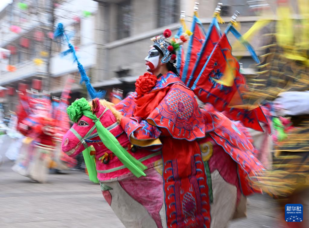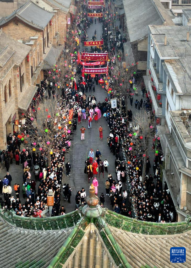 2月6日,社火团队的演员在庙会上表演(无人机照片)。