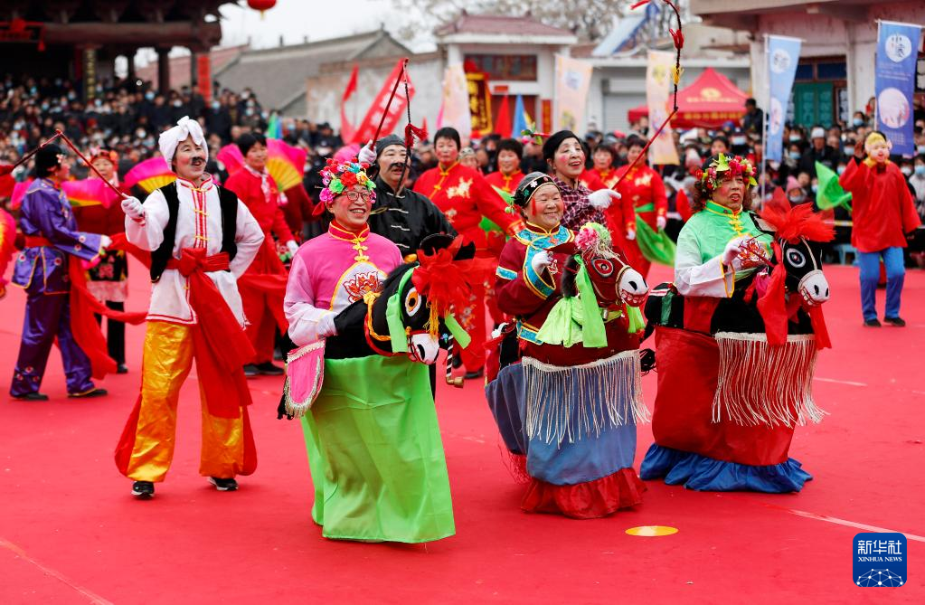 2月21日,在山西省临汾市襄汾县陶寺乡陶寺村,民间社火队在“二月二龙抬头社火节”活动中表演传统民俗“跑驴”。