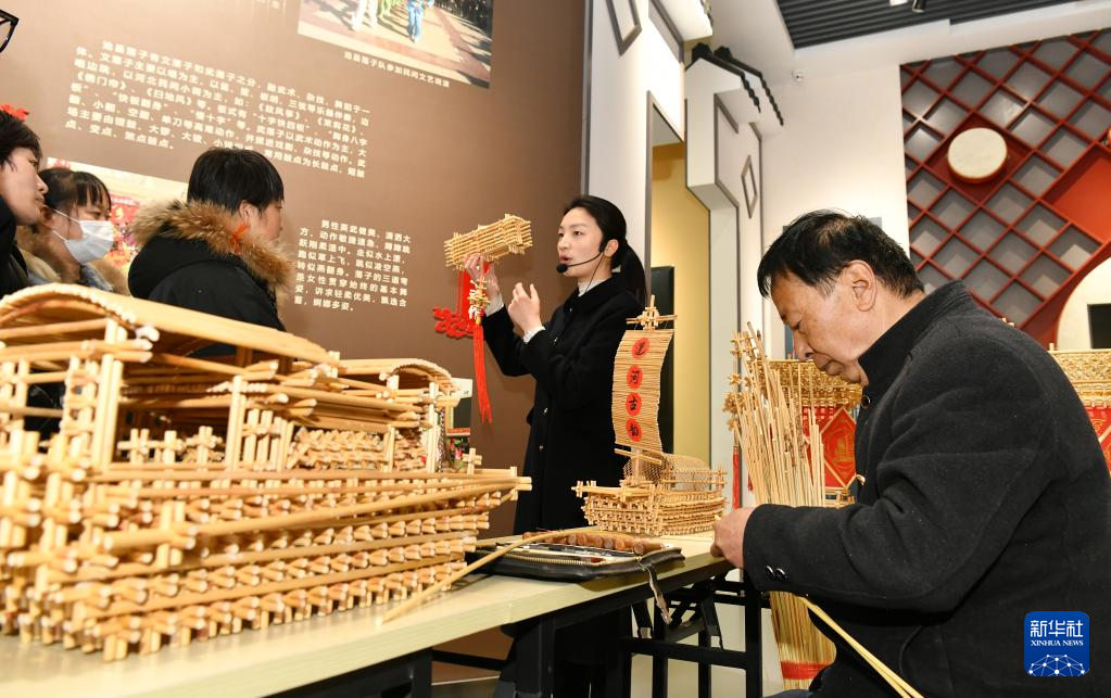 2月22日,秸秆扎编艺人在沧州铁狮与旧城遗址公园现场演示秸秆扎编技艺。