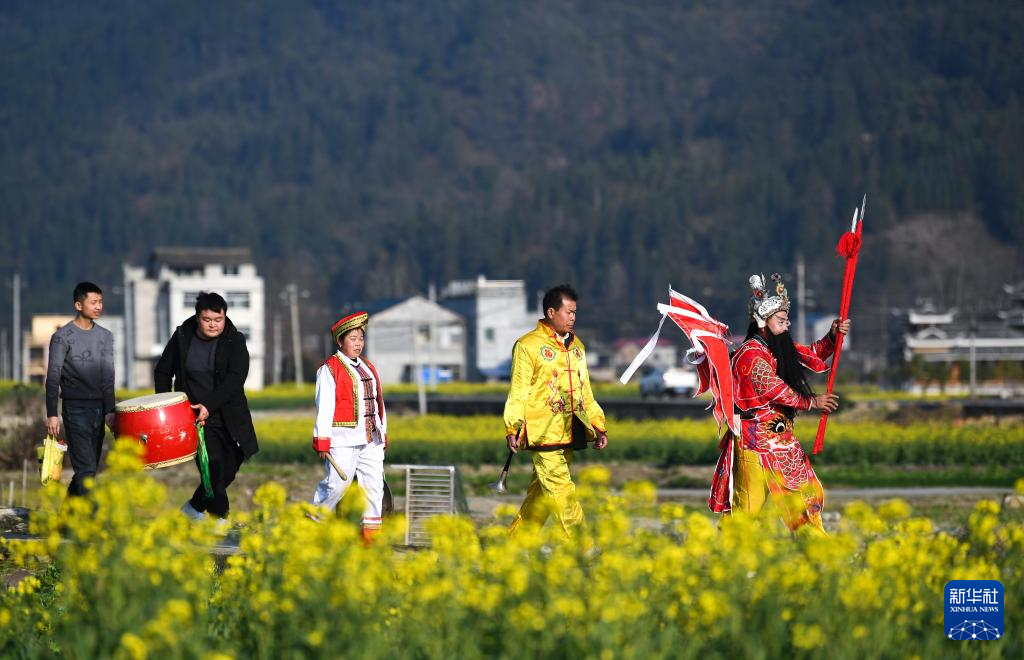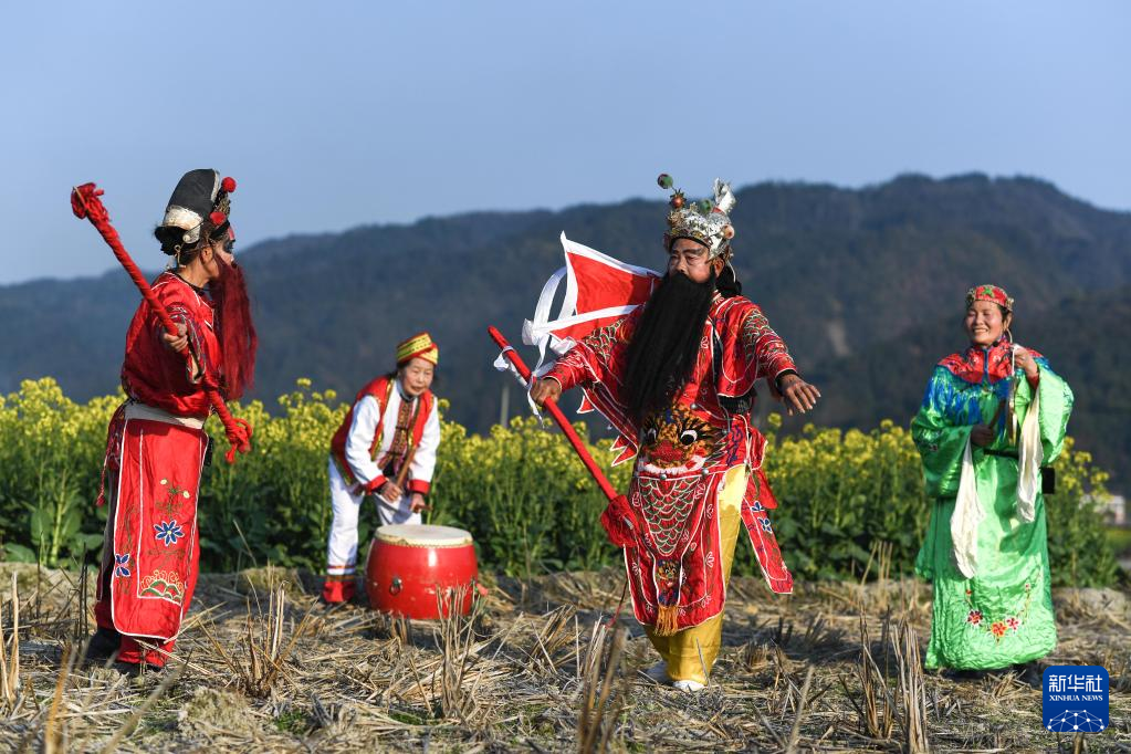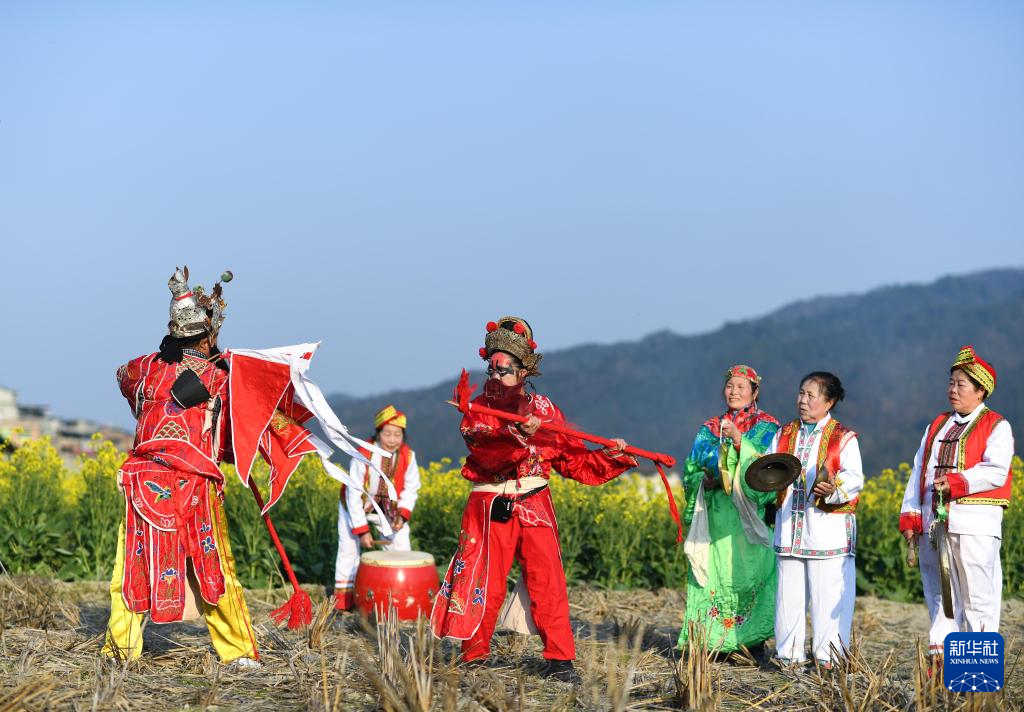 侗戏班在贵州省天柱县凤城街道润松村的田野里排练侗戏(2月26日摄)。