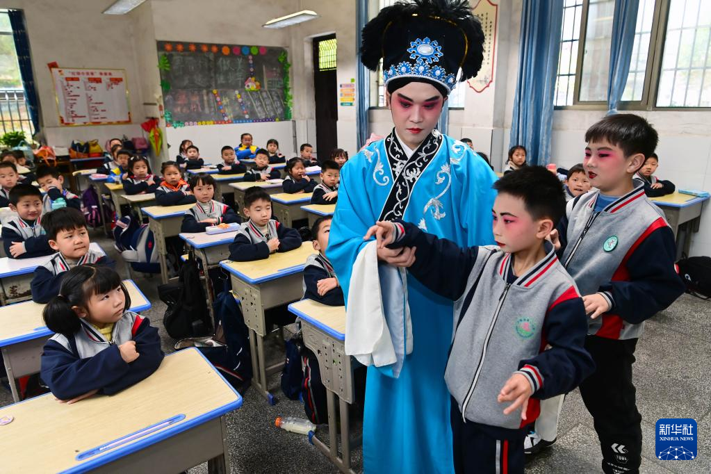 当日是世界戏剧日,江西省宜春市万载县花灯戏剧团演员来到当地第二小学,为学生们讲解和表演花灯戏,让孩子们近距离感受传统戏剧文化的魅力。