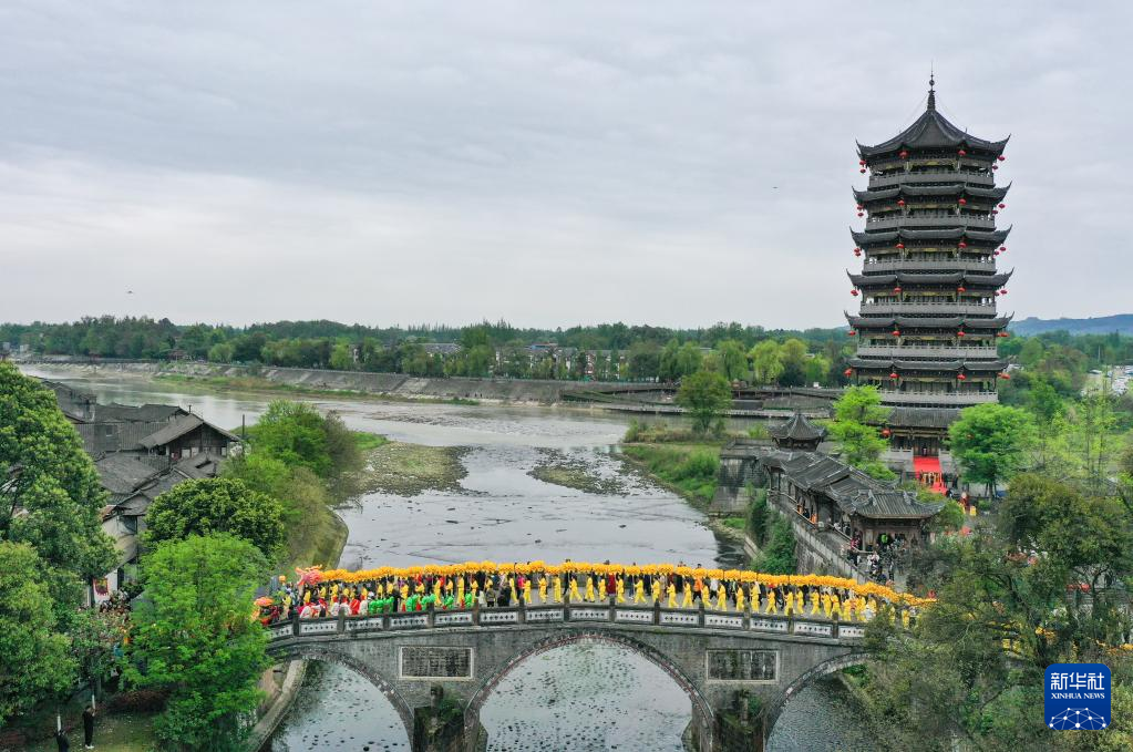 当日,崇州元通清明春台会在四川成都崇州市元通古镇拉开帷幕。由269人手举269截龙身汇聚成的“汇江老龙”,在古街上巡游。
