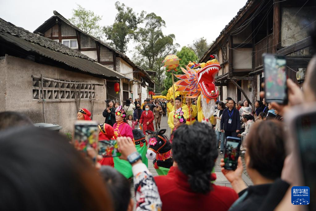 4月5日,游客在成都崇州市元通古镇观看“汇江老龙”巡游表演。