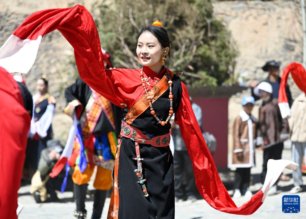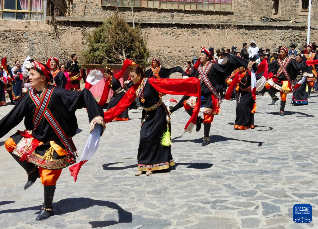 4月12日,村民在卓木齐村举办的糌粑节上表演舞蹈。