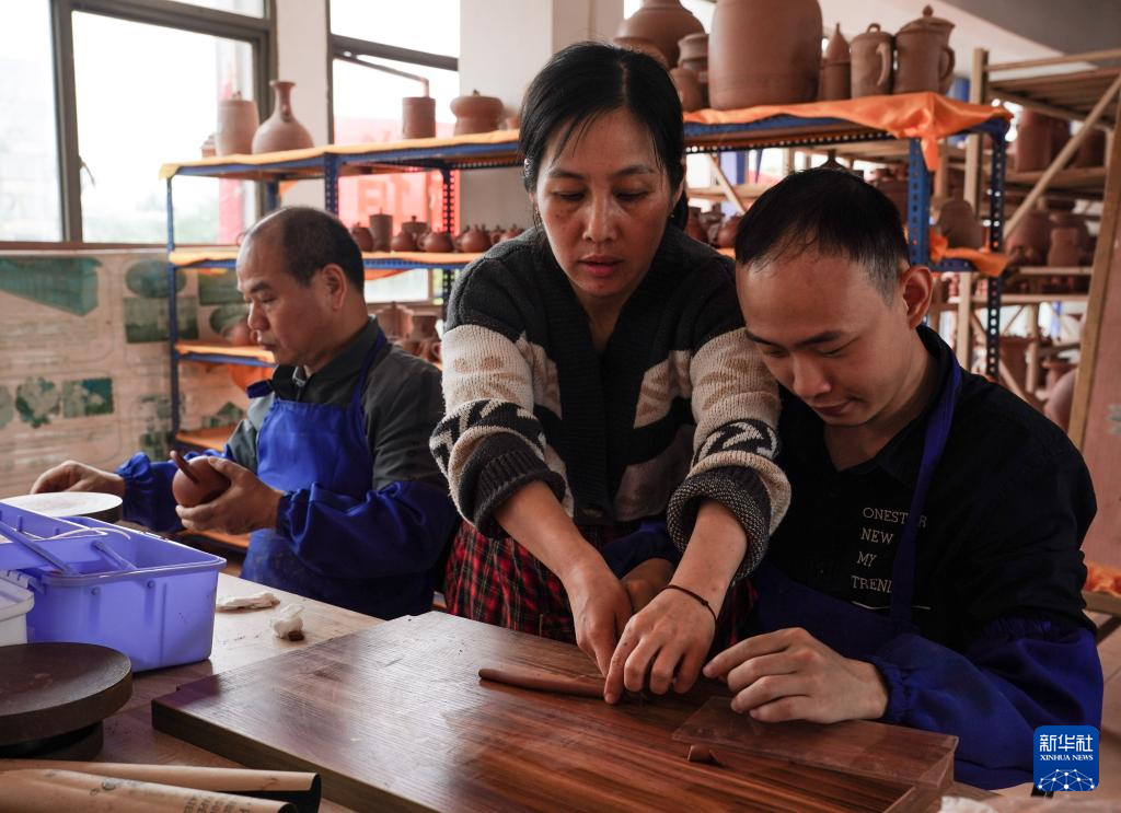 4月11日,在广西钦州市,员工在坭兴陶生产车间进行拼接工作。