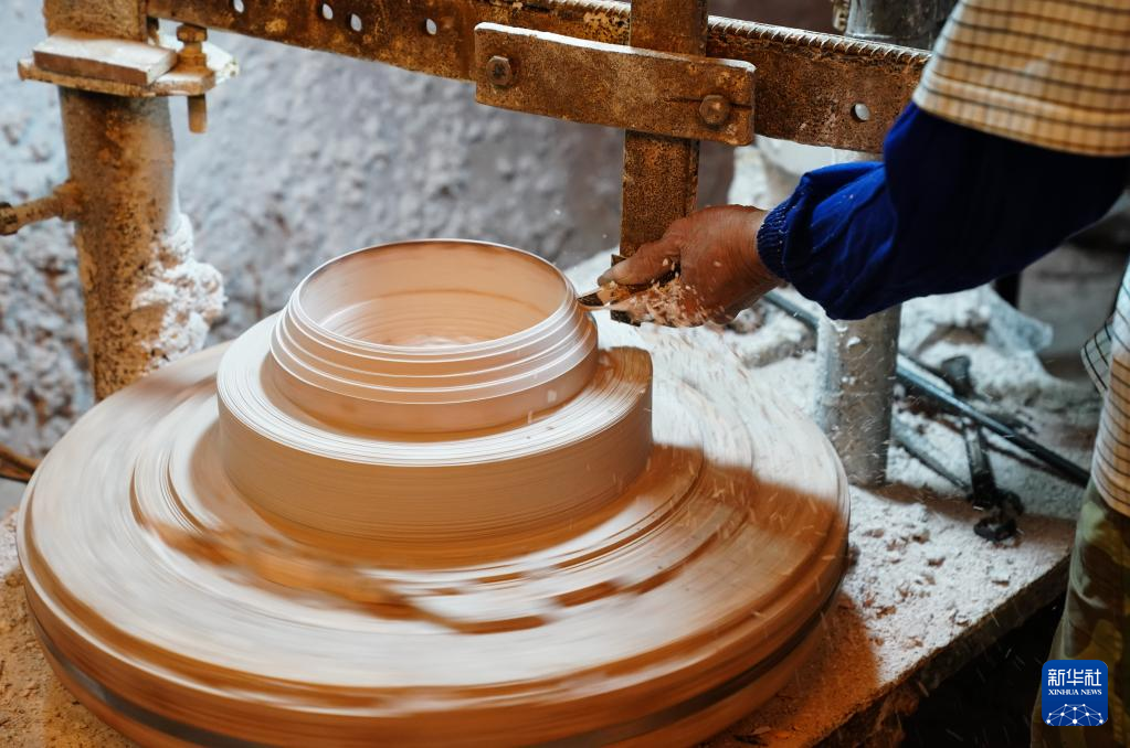 4月11日,在广西钦州市,员工在坭兴陶生产车间进行雕刻工作。