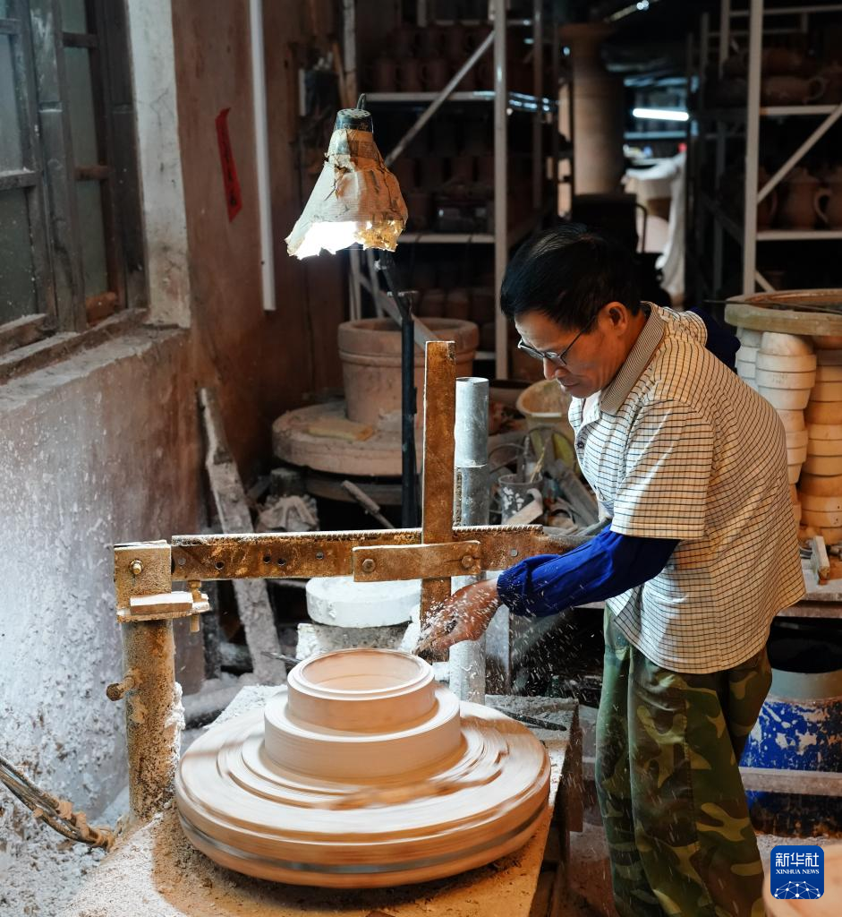 4月11日,在广西钦州市,员工在坭兴陶生产车间工作。