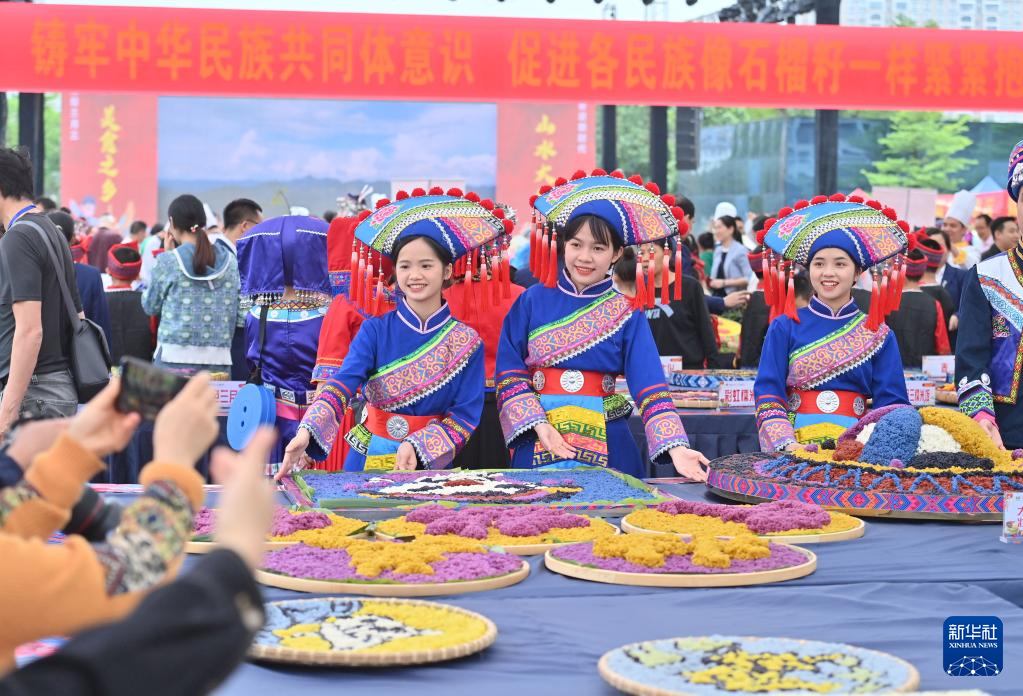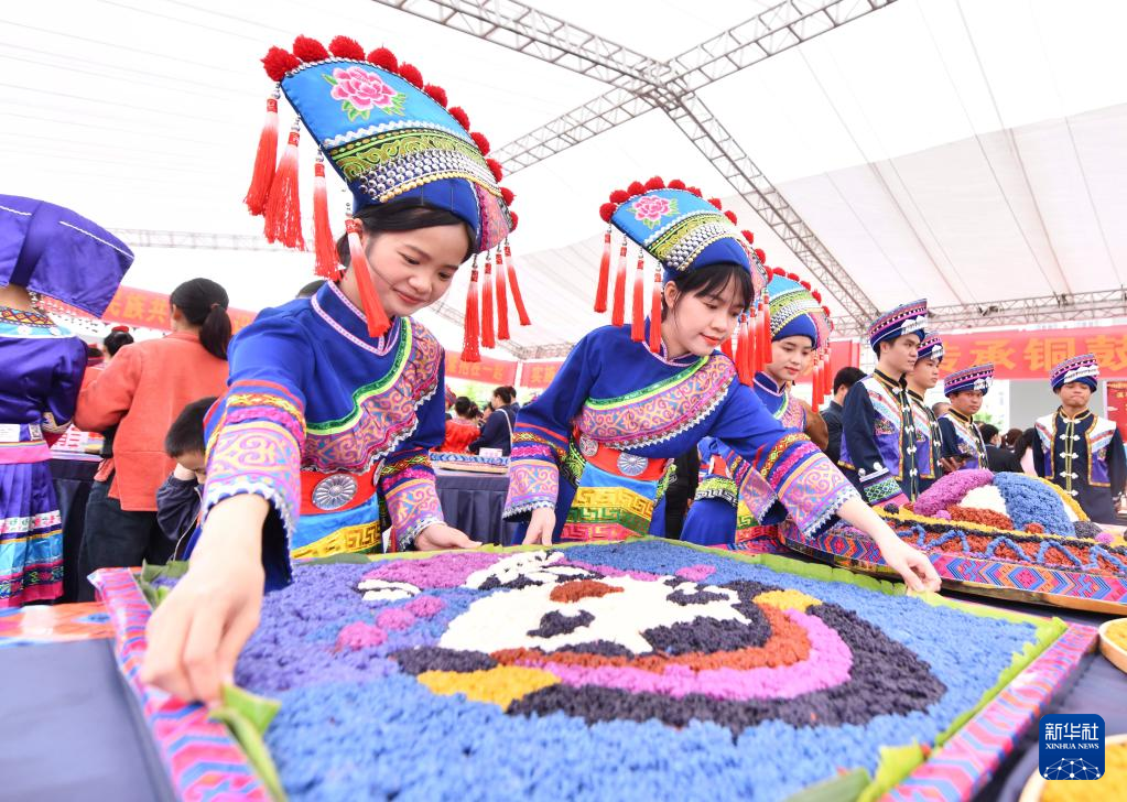 4月15日,参赛选手在广西河池市大化瑶族自治县江滨文化广场摆放“五色糯米饭”参赛作品。