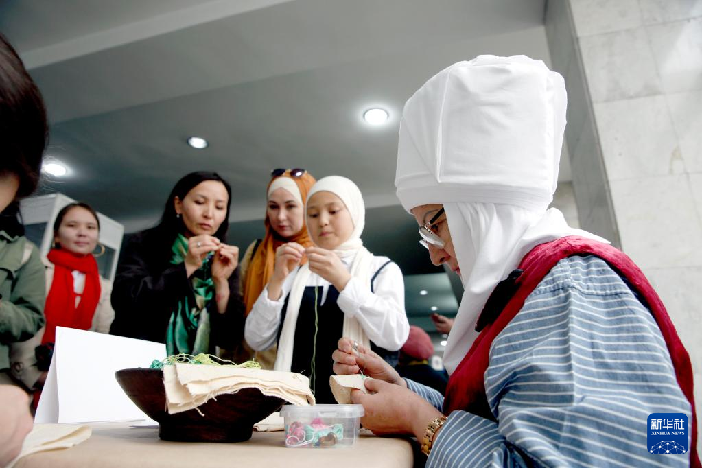 4月15日,在吉尔吉斯斯坦首都比什凯克,人们向手工艺人学习刺绣。