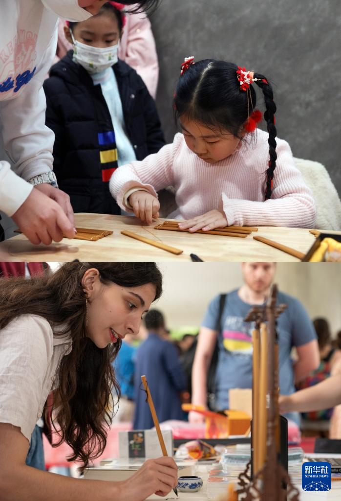 拼版照片:上图为2023年2月4日,小朋友在位于河南安阳的中国文字博物馆体验竹简制作(新华社记者 兰红光 摄);下图为2023年4月19日,在巴西里约热内卢,一名参观者在联合国中文日活动上体验中国书法(新华社记者 王天聪 摄)。