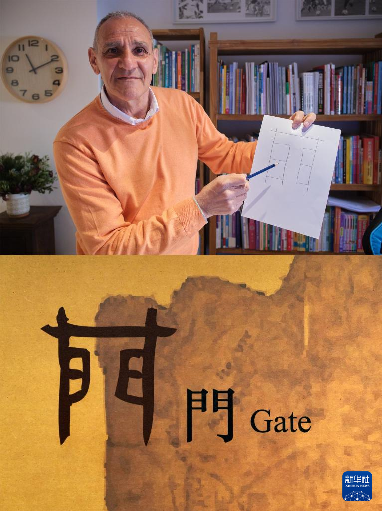 拼版照片:上图为2023年4月17日,阿方索·弗莱勒在西班牙马德里的家中展示刚刚学习的甲骨文“门”字(新华社记者 孟鼎博 摄);下图为2023年4月19日在位于中国河南省安阳市的中国文字博物馆拍摄的“门”字甲骨文(左)(新华社记者 李安 摄)。