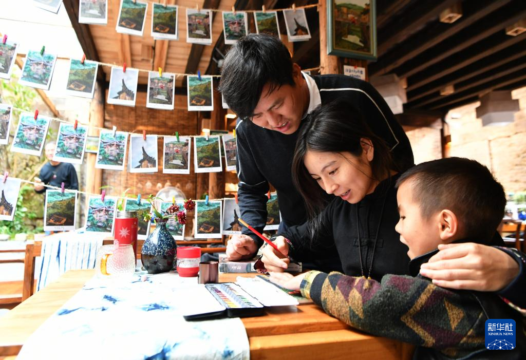 来自江西省吉安市的胡文亮是福建省宁德市屏南县龙潭村引进的文创和专业设计人才。2020年5月,他投资六十多万元翻新改造的兼具酒馆、民宿和陶艺等功能的文创空间正式开业。“十一”黄金周期间接待游客近800人次。这是胡文亮(左一)和爱人曾婉珍(中)、小孩一起在绘制龙潭村主题明信片(2020年10月21日摄)。新华社记者 魏培全 摄