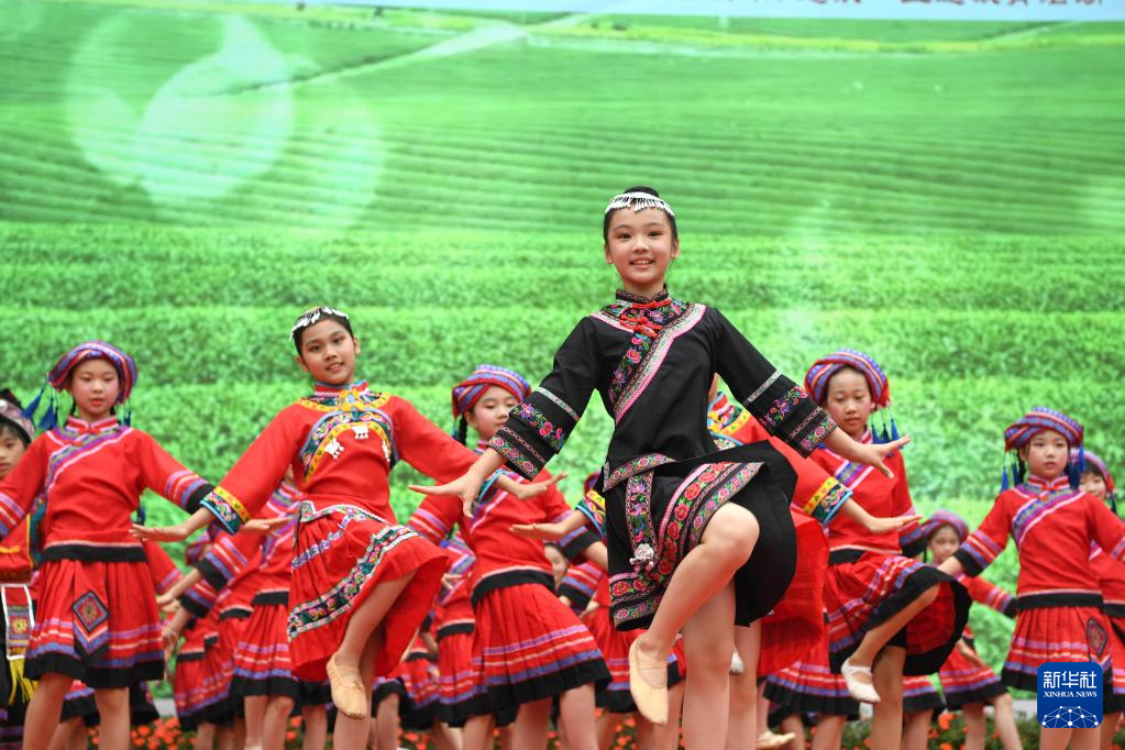 4月20日,孩子们在广西南宁市逸夫小学表演民族舞蹈。