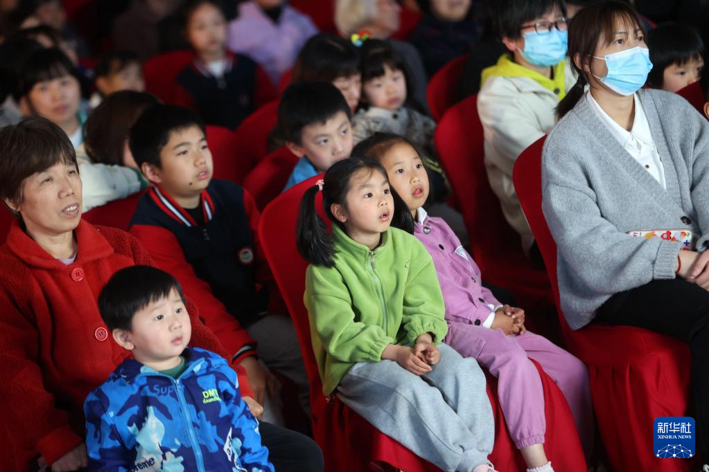 4月24日晚,在德清县禹越镇东港村文化礼堂,孩子们在体验皮影戏表演。