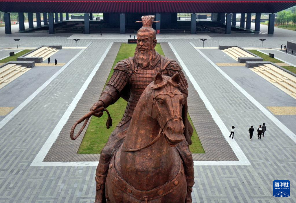 这是4月24日拍摄的曹操高陵遗址博物馆的“魏武挥鞭”塑像(无人机照片)。