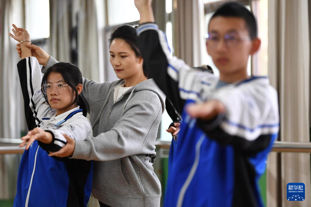 敦煌中学教师张梦婷(中)在舞蹈教室给学生纠正敦煌舞课间操的动作(4月26日摄)。