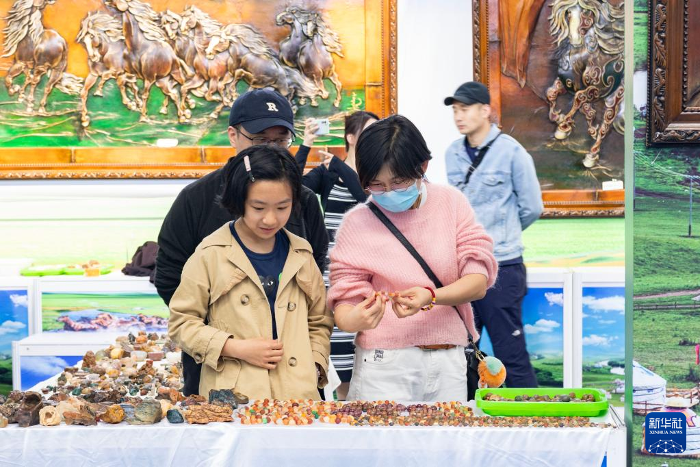 5月7日,在哈尔滨国际会展体育中心,观众在首届东北亚文化艺术创意设计博览会上参观选购。