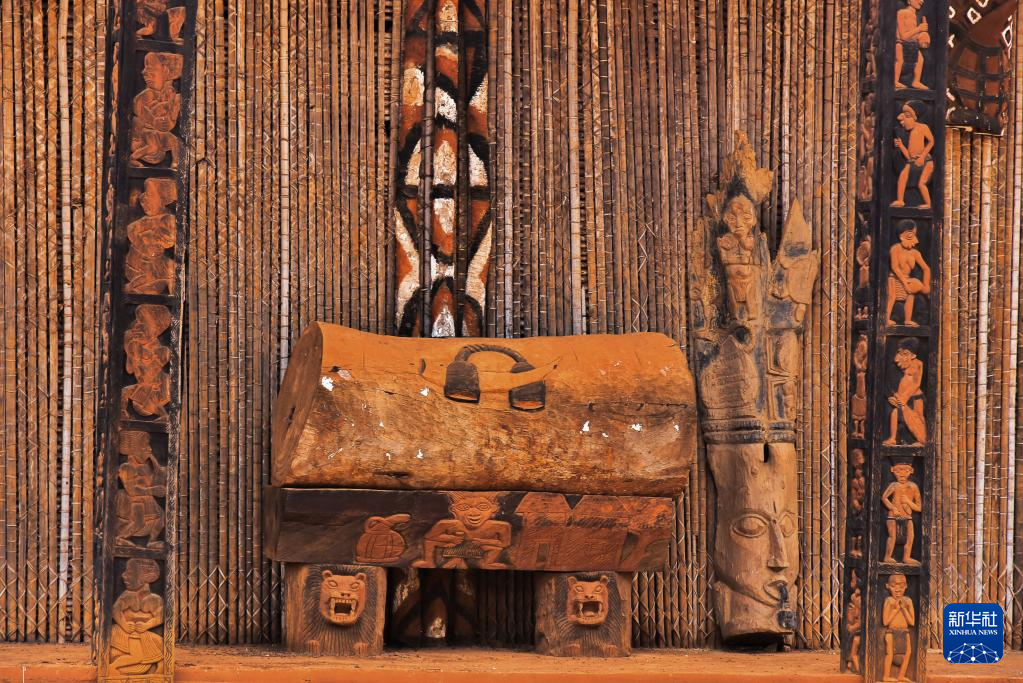 这是4月13日在喀麦隆西部大区拍摄的巴图方酋邦宫殿内的木鼓。