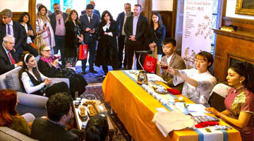 5月6日,游客在江苏省扬州市江都区万达广场的非遗文化展示区向国家级非遗项目扬州漆器髹饰技艺师学习漆器髹饰技艺。