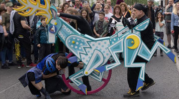5月6日,江苏省扬州市江都区邵伯镇的邵伯龙舞队员与游客互动。