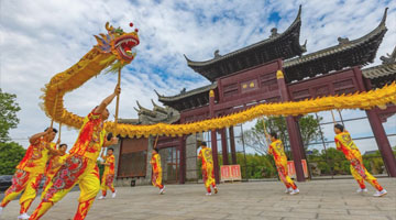 5月7日,江苏省级非遗项目丁伙龙舞表演队在江苏省扬州市江都区丁伙镇朴园表演。
