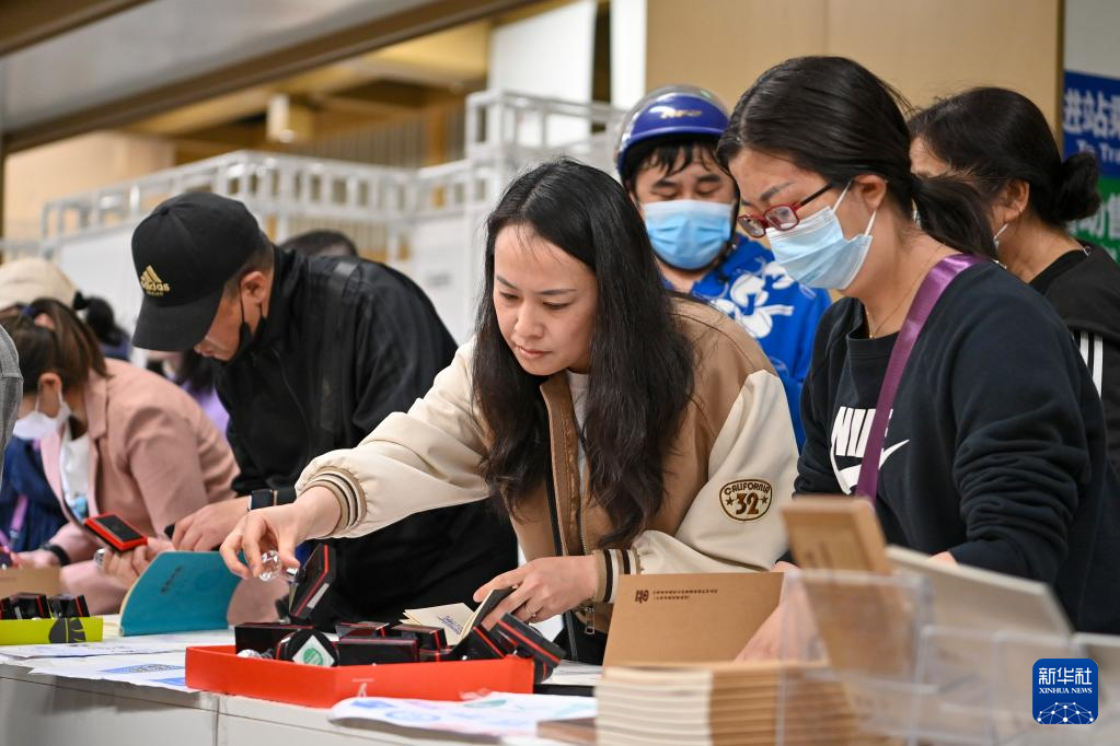 5月9日,在太原地铁2号线大南门站,市民在第三届“印记太原”文化创意设计展上体验古城游集章活动。